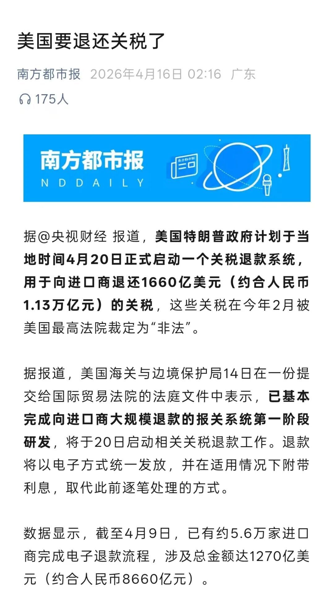 朋友圈很多人在转发一条新闻:特朗普政府将退还1660亿美元关税。